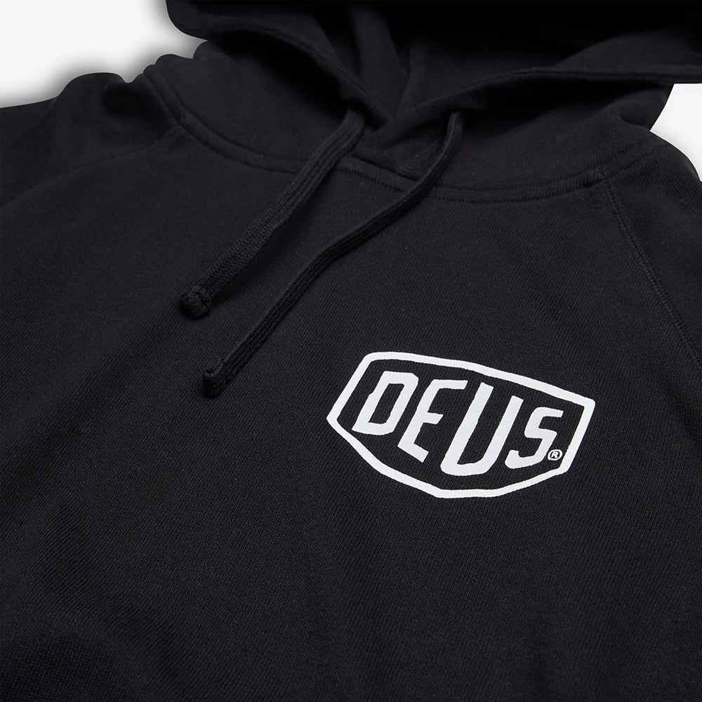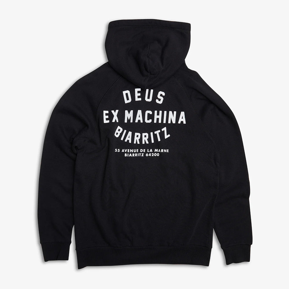 Ce hoodie arbore le célèbre logo Deus brodé sur la poitrine ainsi qu’un print exclusif de l’adresse du flagship Biarritz dans le dos, clin d’œil à l’ancrage européen de la marque. Sa coupe décontractée, sa capuche ajustable et sa poche kangourou en font une pièce essentielle du vestiaire streetwear.