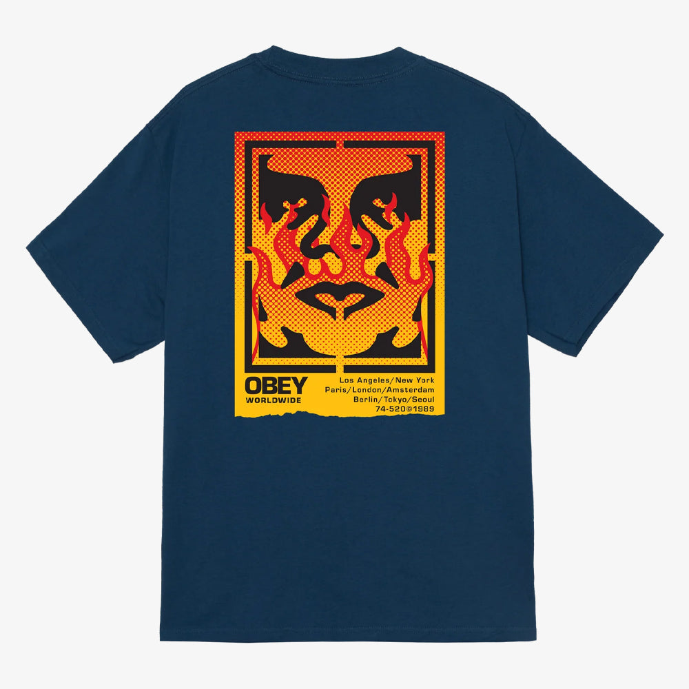 Le Obey Icon Stencil Flame Classic T-Shirt (référence 165264048-HBU) revisite le célèbre visage Obey en version "stencil" enflammée, imprimé dans le dos sur un fond Harbor Blue profond. Véritable hommage à l’univers graphique de Shepard Fairey, ce t-shirt mêle engagement artistique, culture urbaine, et esthétique brûlante.