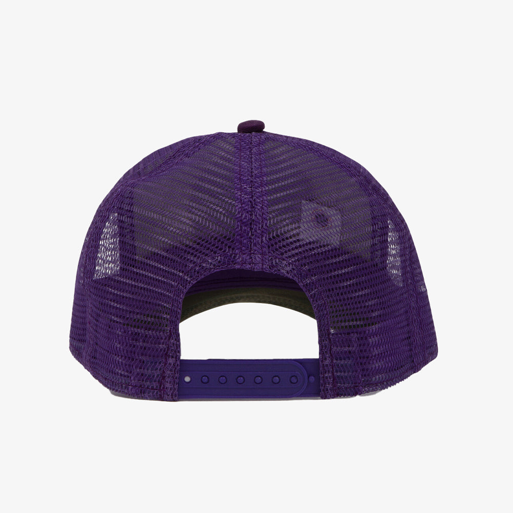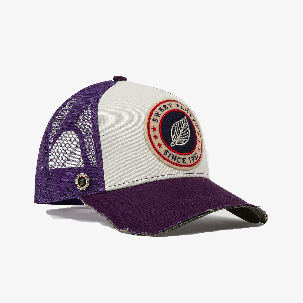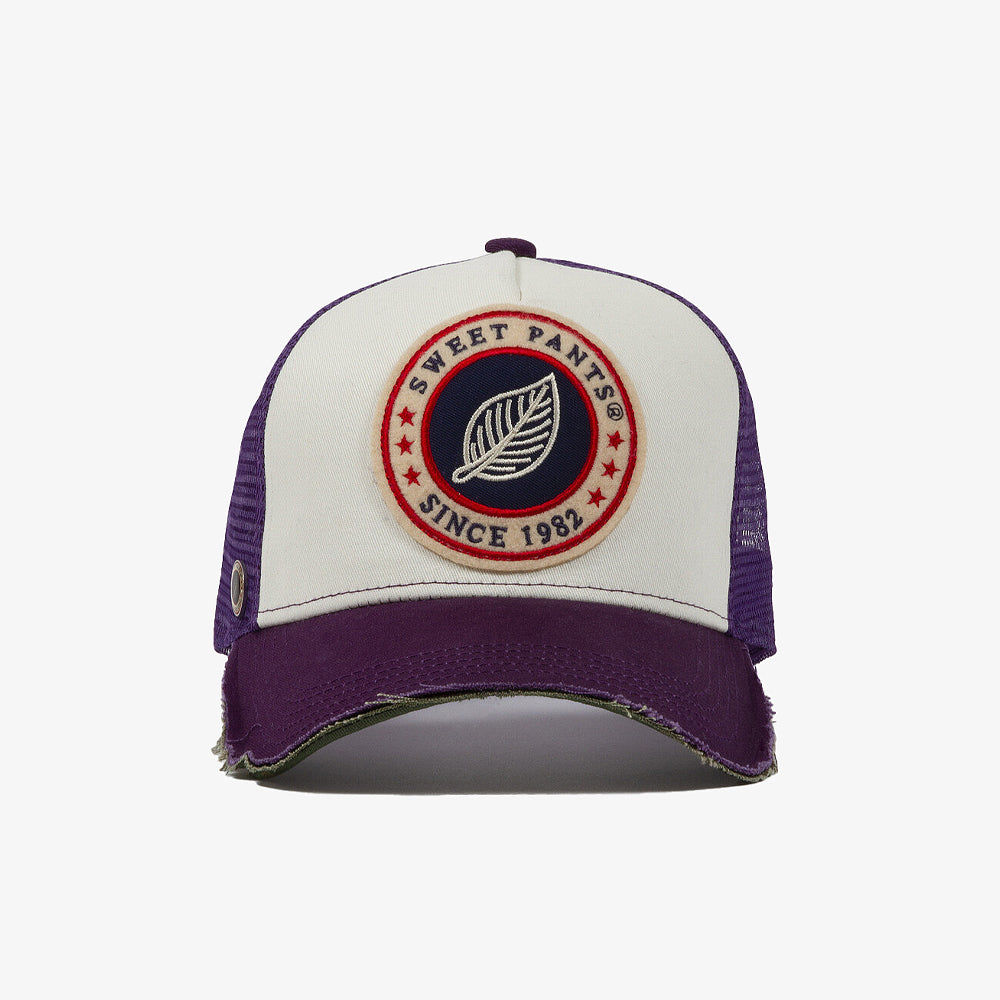 La Sweet Pants Home Run Cap Imperial revisite le style trucker classique avec une touche vibrante grâce à sa visière et son filet arrière violet profond. Son panneau avant en coton blanc cassé met en valeur le large patch brodé tricolore "Sweet Pants Since 1982", signature emblématique de la marque.