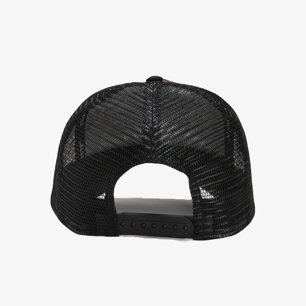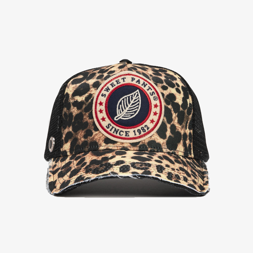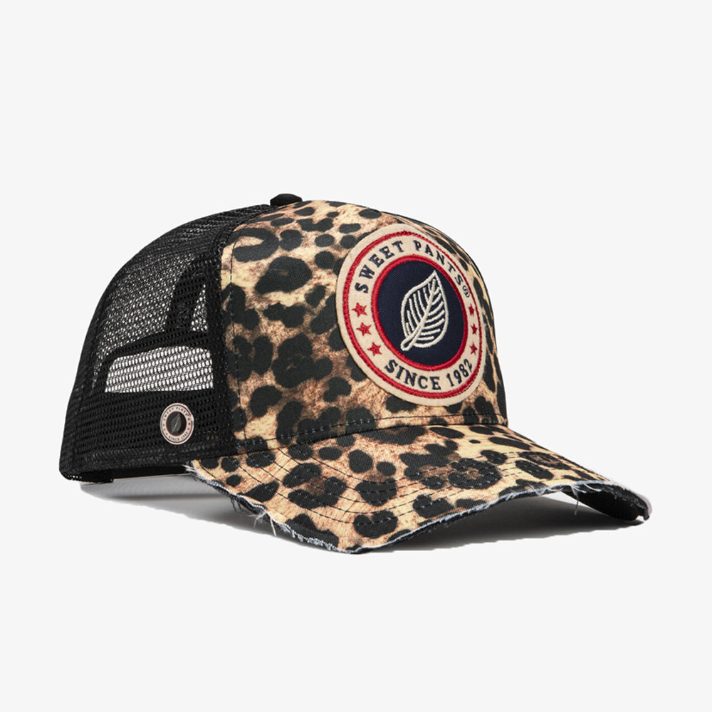 La Home Run Full Leo Black de Sweet Pants revisite la casquette trucker avec un style audacieux entièrement recouvert d’imprimé léopard. Son design marie un filet noir à l’arrière et un large patch logo tricolore brodé sur l’avant, offrant un look streetwear distinctif.
