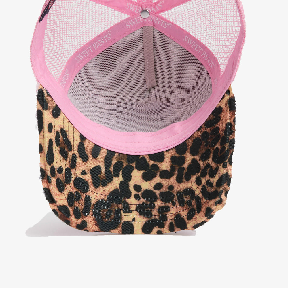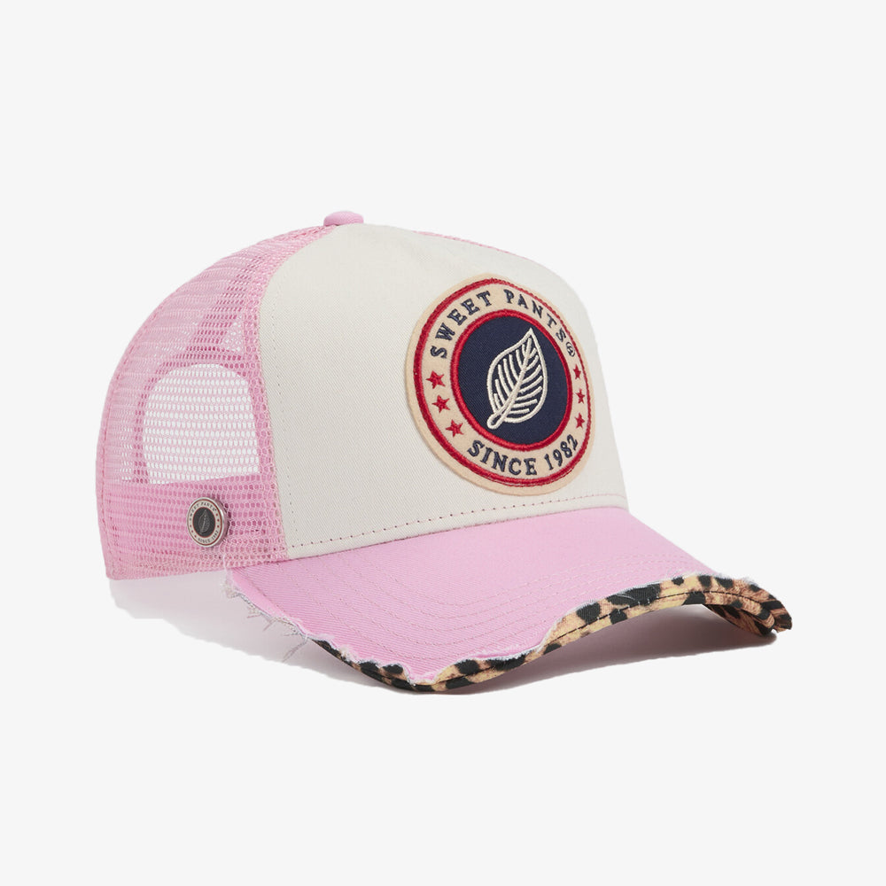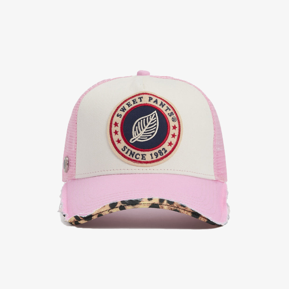 La Sweet Pants Home Run Leo Logo Peony se distingue par son patch en feutrine tricolore brodé sur un fond rose tendre (Peony), subtilement contrasté par un dessous de visière à imprimé léopard. Sa construction en toile de coton et filet respirant incarne l’équilibre parfait entre style urbain et confort.